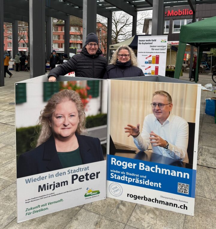 Mit dabei waren die Stadtratskandidaten Mirjam Peter und Roger Bachmann. Roger Bachmann tritt auch erneut als Kandidat für das Stadtpräsidium an. Sowohl diese beiden wie auch die Gemeinderats- und Schulpflegekandidierenden stehen für eine bürgernahe, verantwortungsvolle und entschlossene Politik für Dietikon.